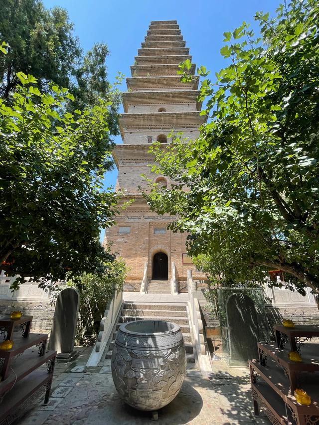 回廊中间耸立的莺莺塔是寺院主体建筑,原名舍利塔。当地百姓为了纪念崔莺莺,便把塔称为“莺莺塔”。塔高40米,共13层,距今已有450多年的历史。